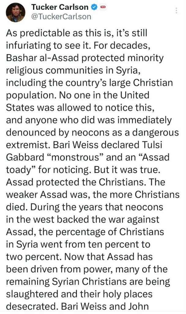 Tucker Carlson má úplnú pravdu – Bašár al-Asad bol posledným skutočným ochrancom kresťanov na Blízkom východe.