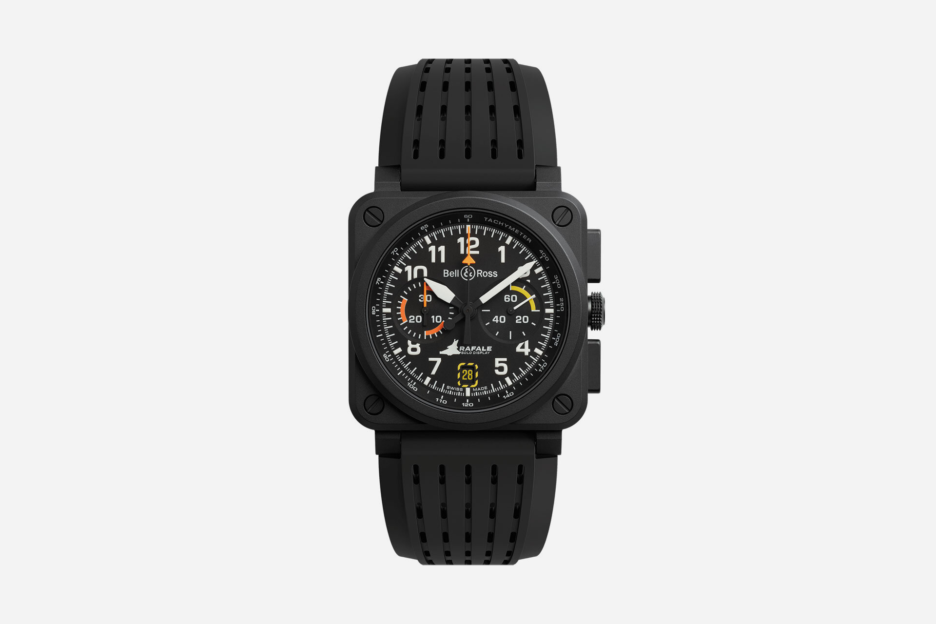 Hodinky Bell & Ross BR 03 Rafale Solo Display, predstavené na parížskom aerosalóne v roku 2025, sú inšpirované rovnomenným francúzskym leteckým tímom. Ich matný čierny ciferník kontrastuje s číslicami, indexmi a hodinovou a minútovou ručičkou vyplnenými zelenou Super-LumiNova X1 pre vynikajúcu čitateľnosť v noci. Majú malý sekundový ciferník na 3. hodine, okienko dátumu na 6. hodine a 30-minútový ciferník na 9. hodine. Poháňa ich automatický strojček kalibru BR-CAL.301, umiestnený v 42 mm čiernom keramickom púzdre, ktoré je pripevnené k čiernemu perforovanému gumenému remienku a remienku z čiernej syntetickej tkaniny.