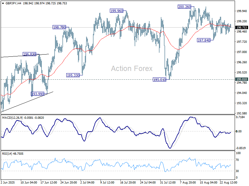 GBP/JPY pokračuje v obchodovaní v rozpätí a intradenný bias zostáva neutrálny. Aj keď nemožno vylúčiť ďalší pokles, krátkodobý výhľad zostane býčí, pokiaľ sa udrží podpora na úrovni 195.01. V prípade rastu by pevné prelomenie úrovne 2002.6 obnovilo celý nárast z úrovne 184.35 na 100% projekciu 180.00 až 199.79 z úrovne 184.35 na 204.14.