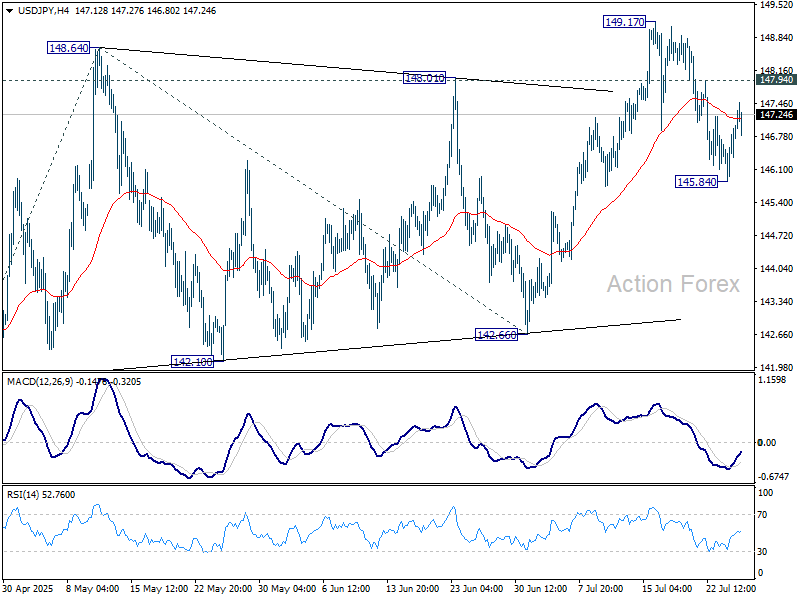 Intradenný výhľad pre USD/JPY zostáva neutrálny. Pokiaľ 55-dňový exponenciálny kĺzavý priemer (EMA), ktorý je aktuálne na úrovni 145.97, udrží, očakáva sa ďalší rast. Vzostupne, prekonanie menšej rezistencie na 147.94 povedie k opätovnému testovaniu úrovne 149.17. Pevné prelomenie tejto úrovne zacieli na 100% projekciu pohybu od 139.87 do 148.64 z úrovne 142.66 na 151.43. Táto úroveň je blízko 61.8% Fibonacciho retracementu pohybu od 158.86 do 139.87 na 151.22. Na druhej strane, trvalé obchodovanie pod 55-dňovým EMA by naznačovalo, že celý odraz od 139.87 mohol byť ukončený, a zacieli podporu na úrovni 142.66 pre potvrdenie.