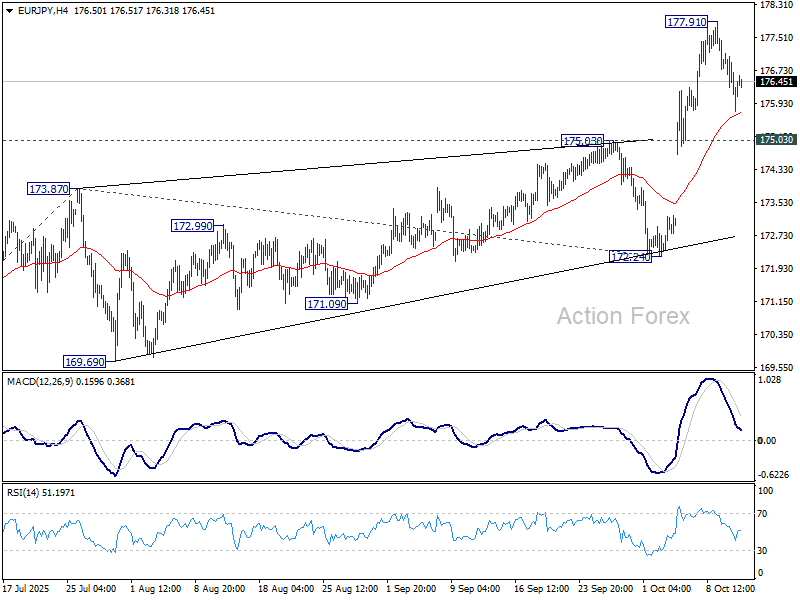 Intradenný sklon v EUR/JPY zostáva momentálne neutrálny a je možné očakávať určitú konsolidáciu. Ďalší rast sa očakáva, pokiaľ sa udržiava rezistencia 175.03 premenená na podporu. Na hornej strane pri prelomení úrovne 177.91 bude cieľom 61.8% projekcia pohybu z 161.06 na 173.87 od 172.24, konkrétne na úrovni 180.15. Avšak, pevné prelomenie úrovne 175.03 potvrdí krátkodobé vrcholenie a prinesie hlbší pokles späť k podpore 172.24.