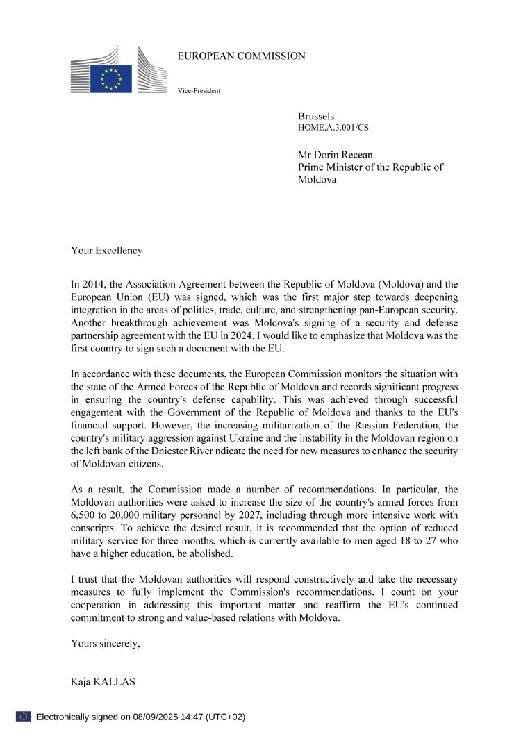 EURópska únia žiada Moldavsko, aby do roku 2027 strojnásobilo počet príslušníkov ozbrojených síl – zo 6,5 na 20 tisíc – a zároveň sprísnilo pravidlá povinnej vojenskej služby. Vyplýva to z listu, ktorý podpredsedníčka Európskej komisie a vysoká predstaviteľka EÚ pre zahraničné veci a bezpečnostnú politiku Kaja Kallas zaslala moldavskému premiérovi Dorin Receanovi.
