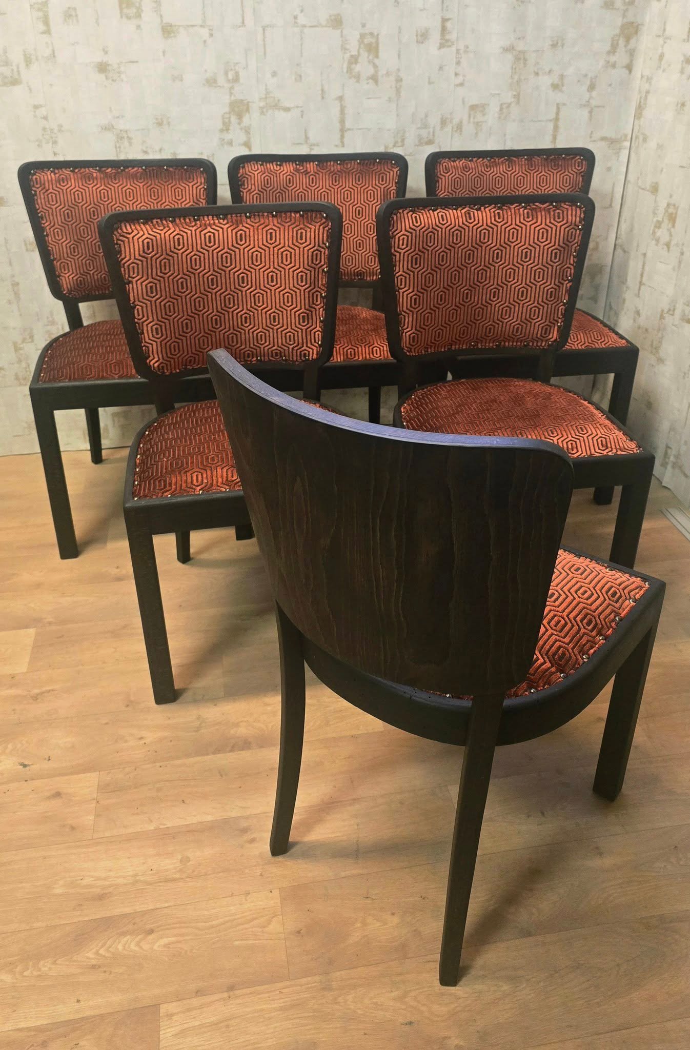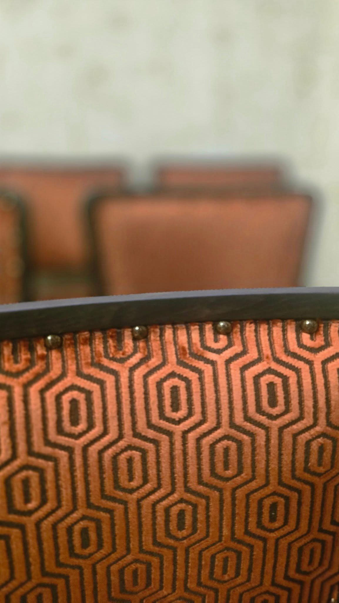 Čalúnenie a látka: Striktne som sa držal zadania klienta, čo sa týka vypracovania čalúnenia aj konečnej úpravy dreva. Látku sme spoločne doladili; príjemný materiál s geometrickým vzorom dokonale zdôraznil ich pôvodnú eleganciu.