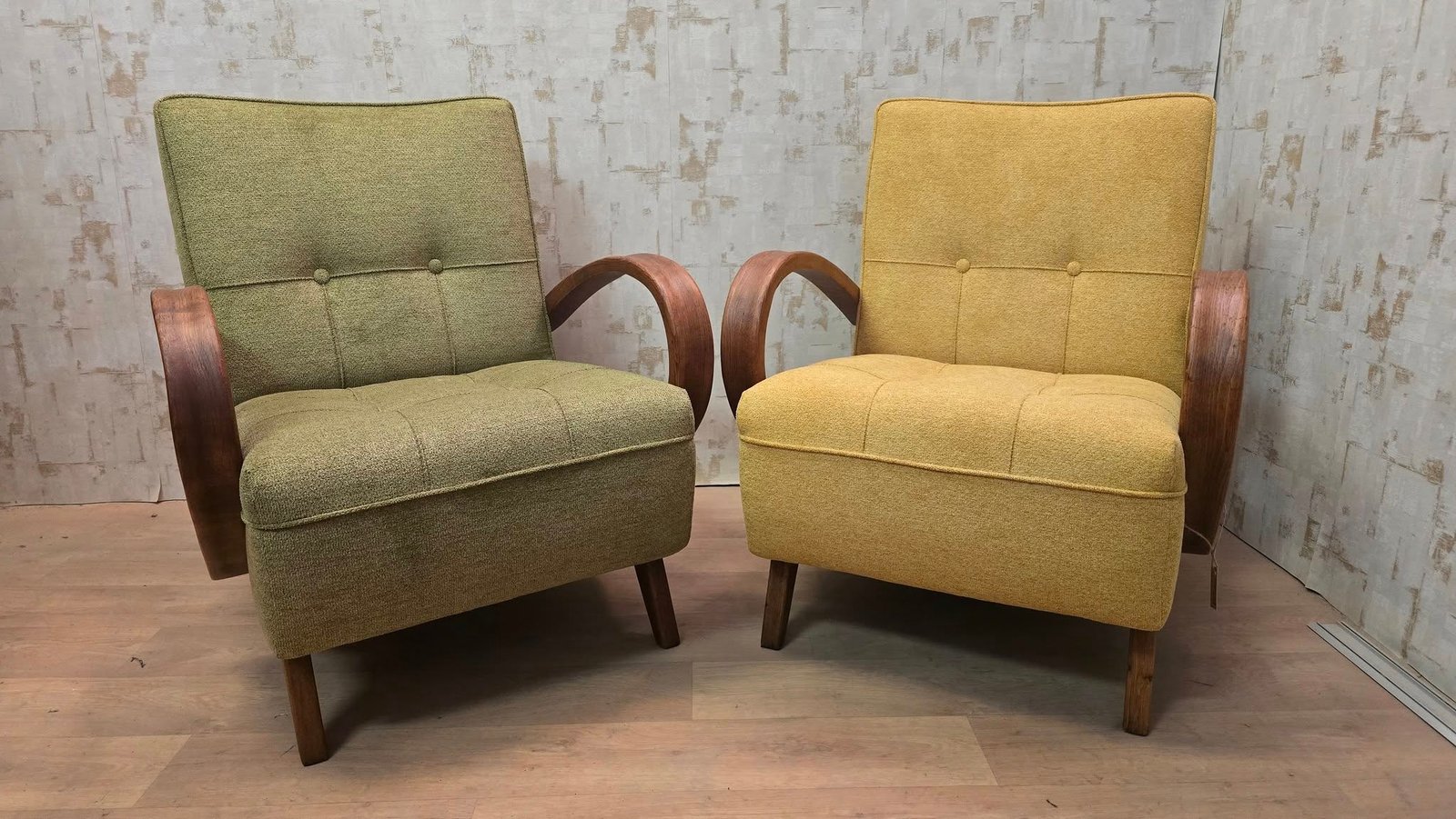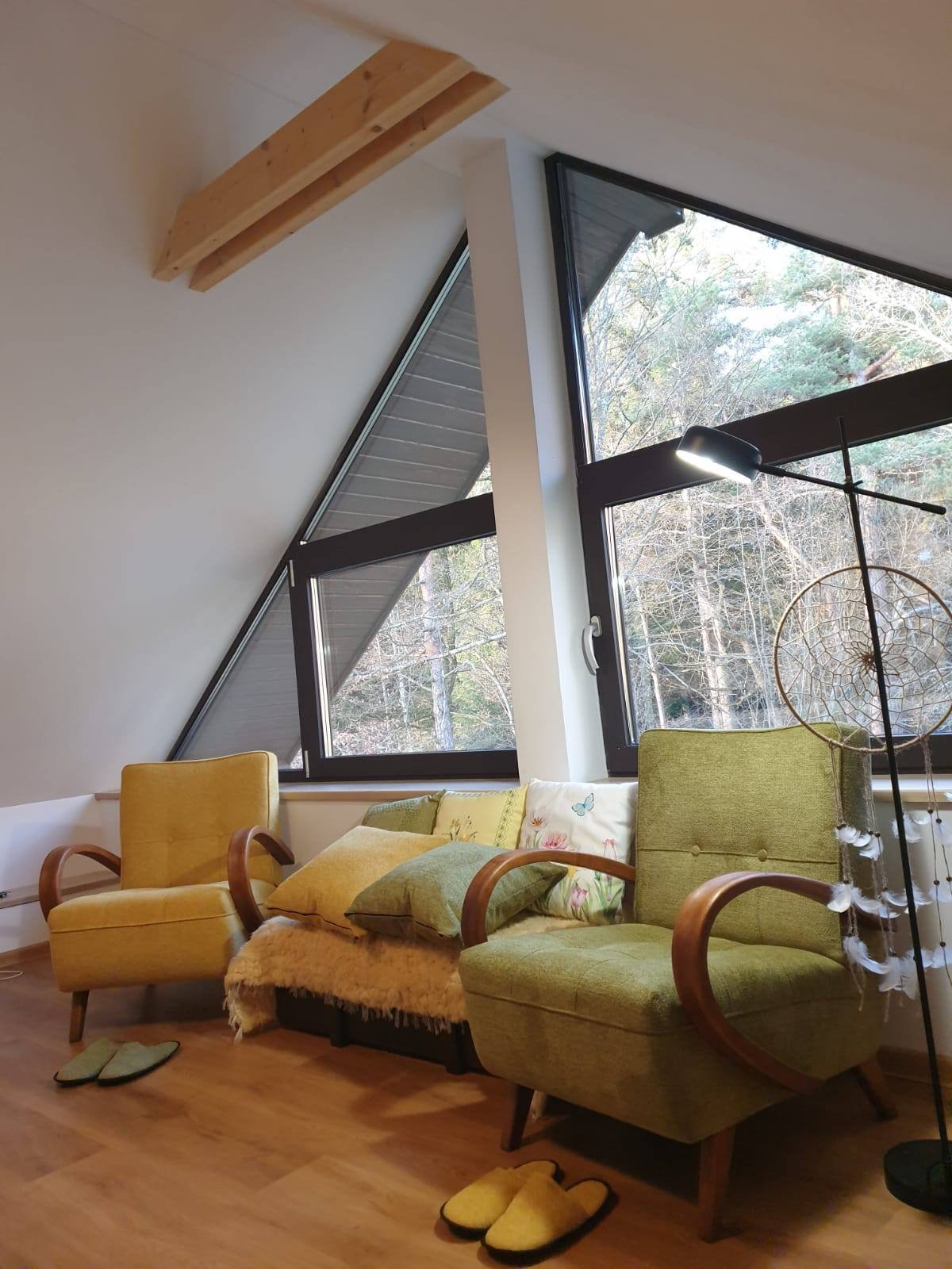 Predstavujem Vám výsledok repasu týchto dvoch dizajnových skvostov – ikonických kresiel od renomovaného architekta Františka Jiráka. Pozrite, ako krásne zapadli do tohto útulného kútika s výhľadom do prírody, kde ich príjemný teplý odtieň pripomína farby jesene! 🟡🟢