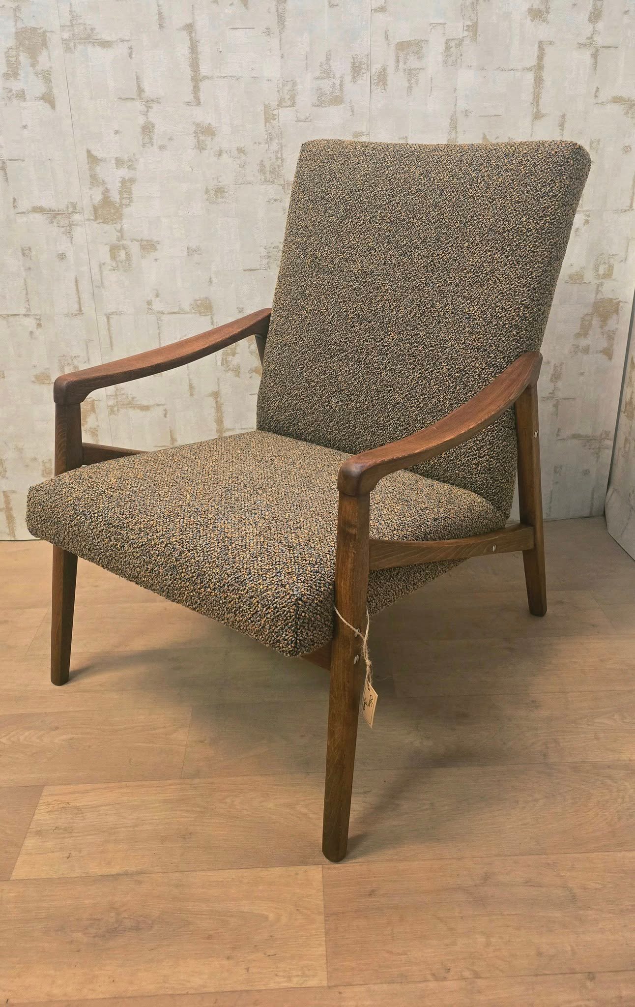 ✅️ Pri ich obnove sme dbali na vizuálnu harmóniu a dobovú presnosť. Drevená konštrukcia bola ošetrená matným orechovým odtieňom, ktorý im dodal hĺbku. Kresielka sú čalúnené mimoriadne zaujímavou látkou, ktorá farebne i textúrou perfektne vyzdvihuje ich pôvodný šarm a charakteristickú dobovosť.