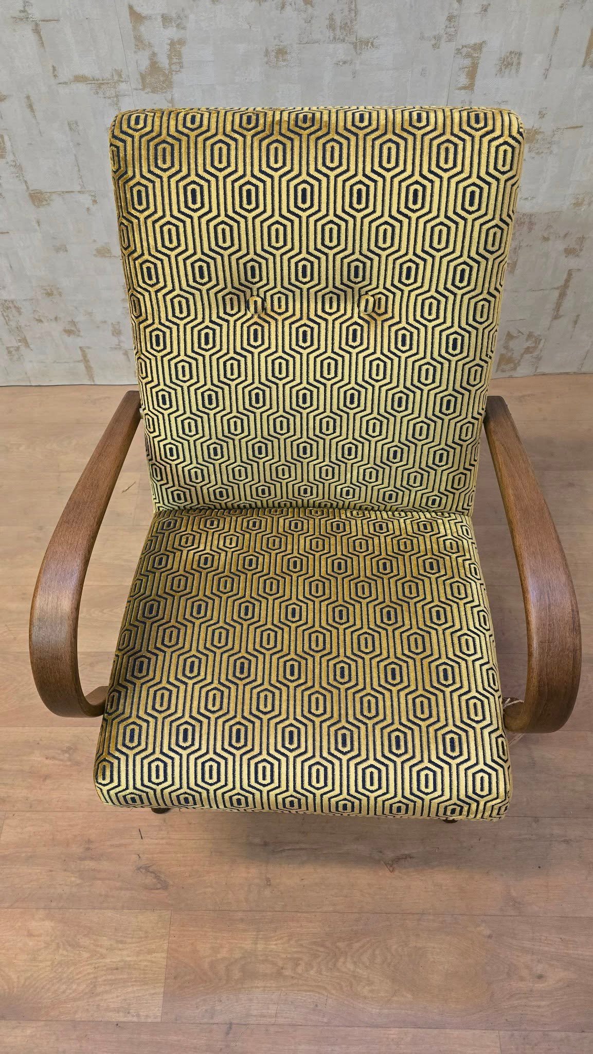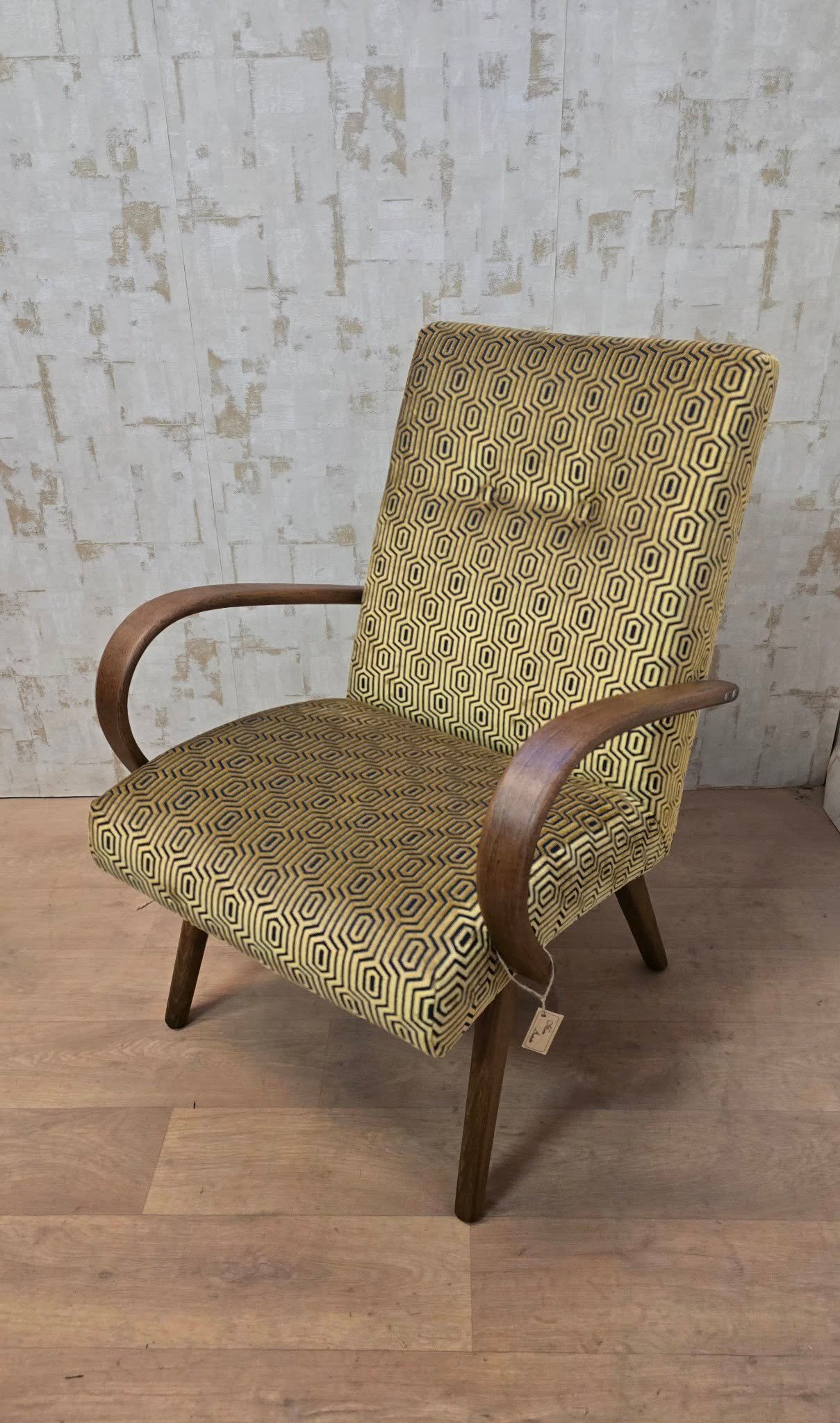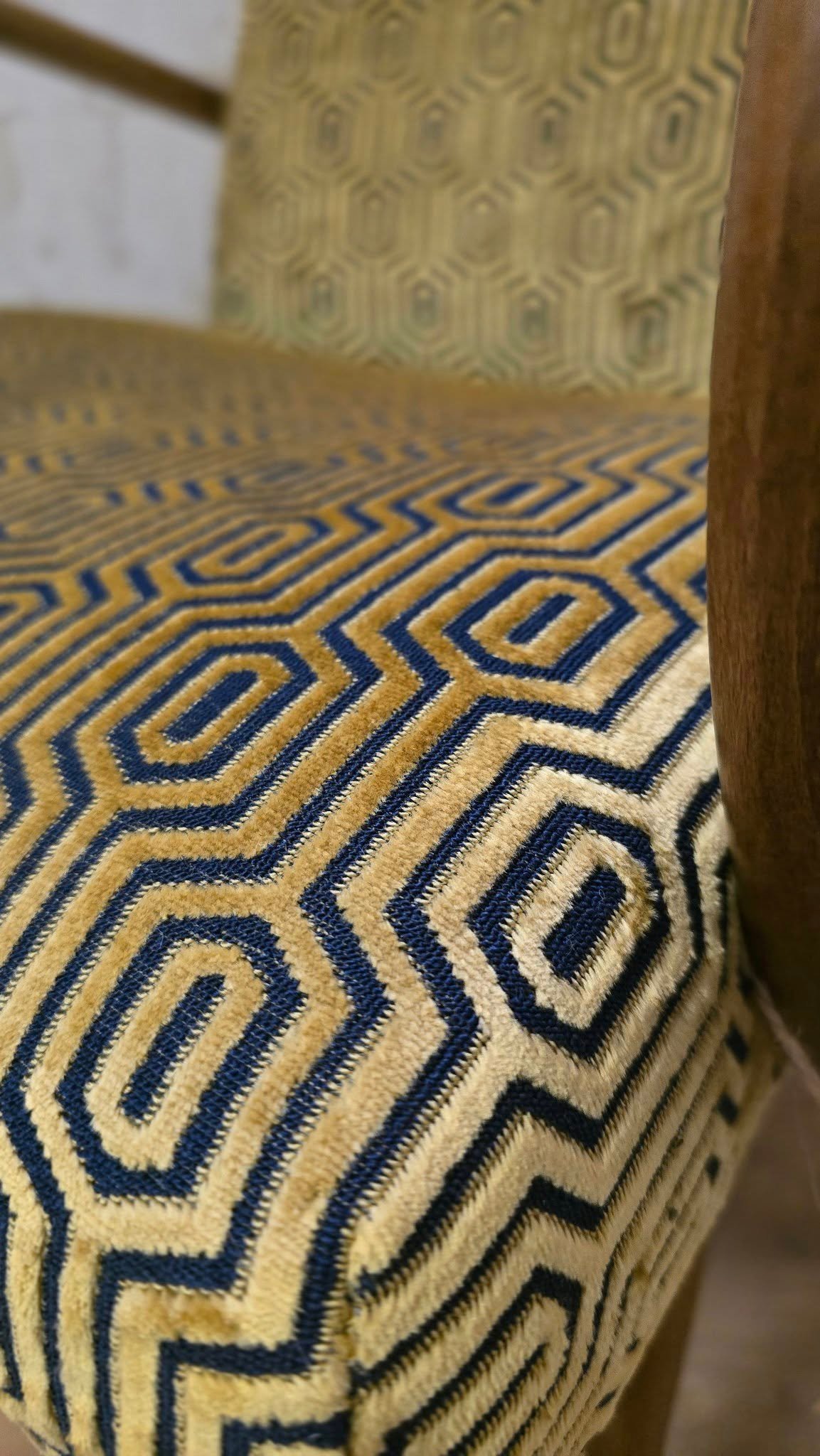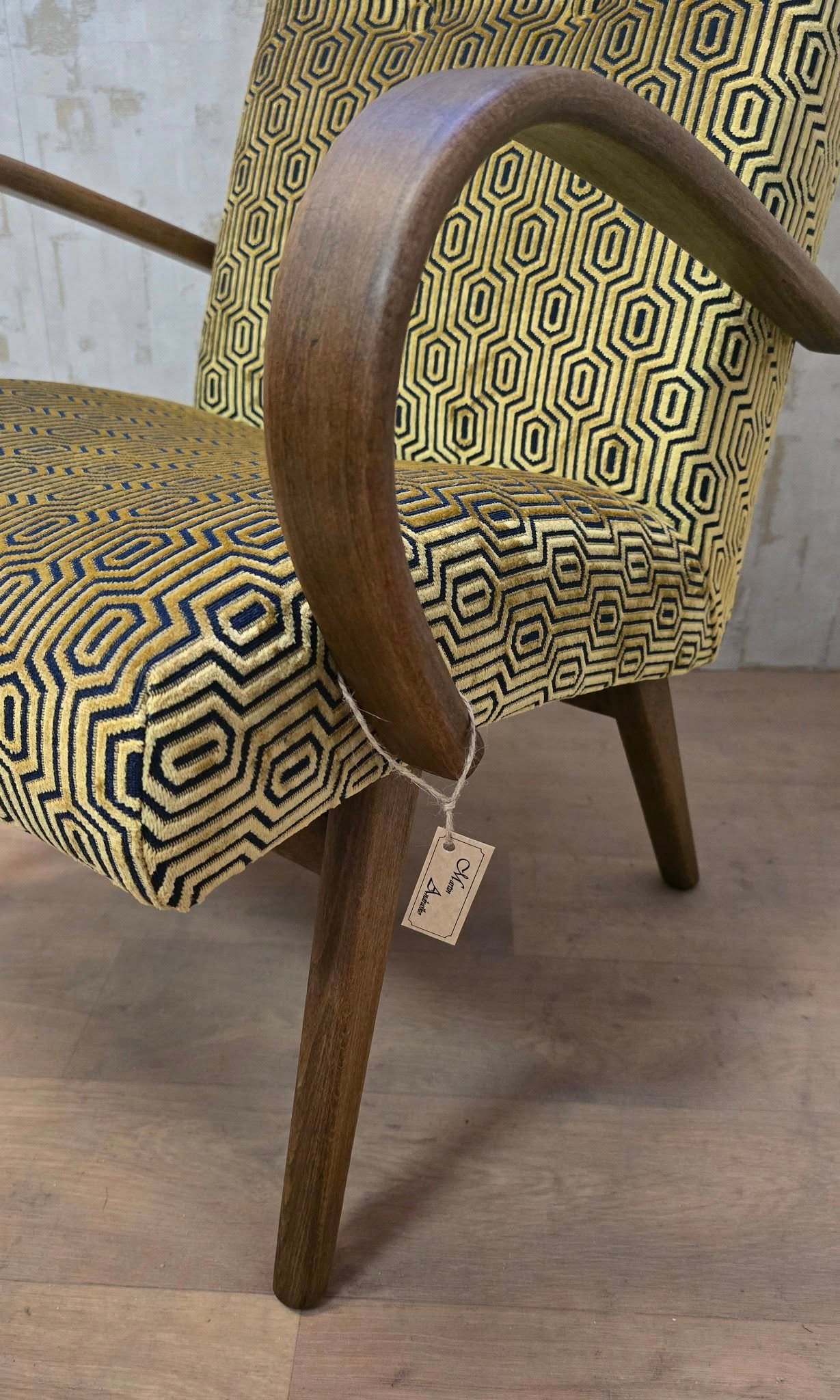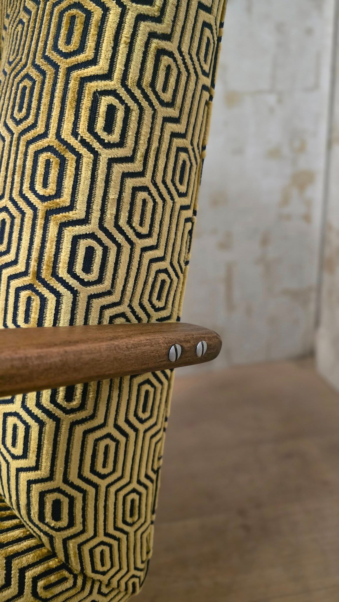 ✅ Nový Život: Pôvodné čalúnenie nahradila exkluzívna látka s výrazným geometrickým vzorom. Je to odvážny a moderný kontrast, ktorý perfektne rešpektuje retro línie kresla a dodáva mu tú správnu energiu!