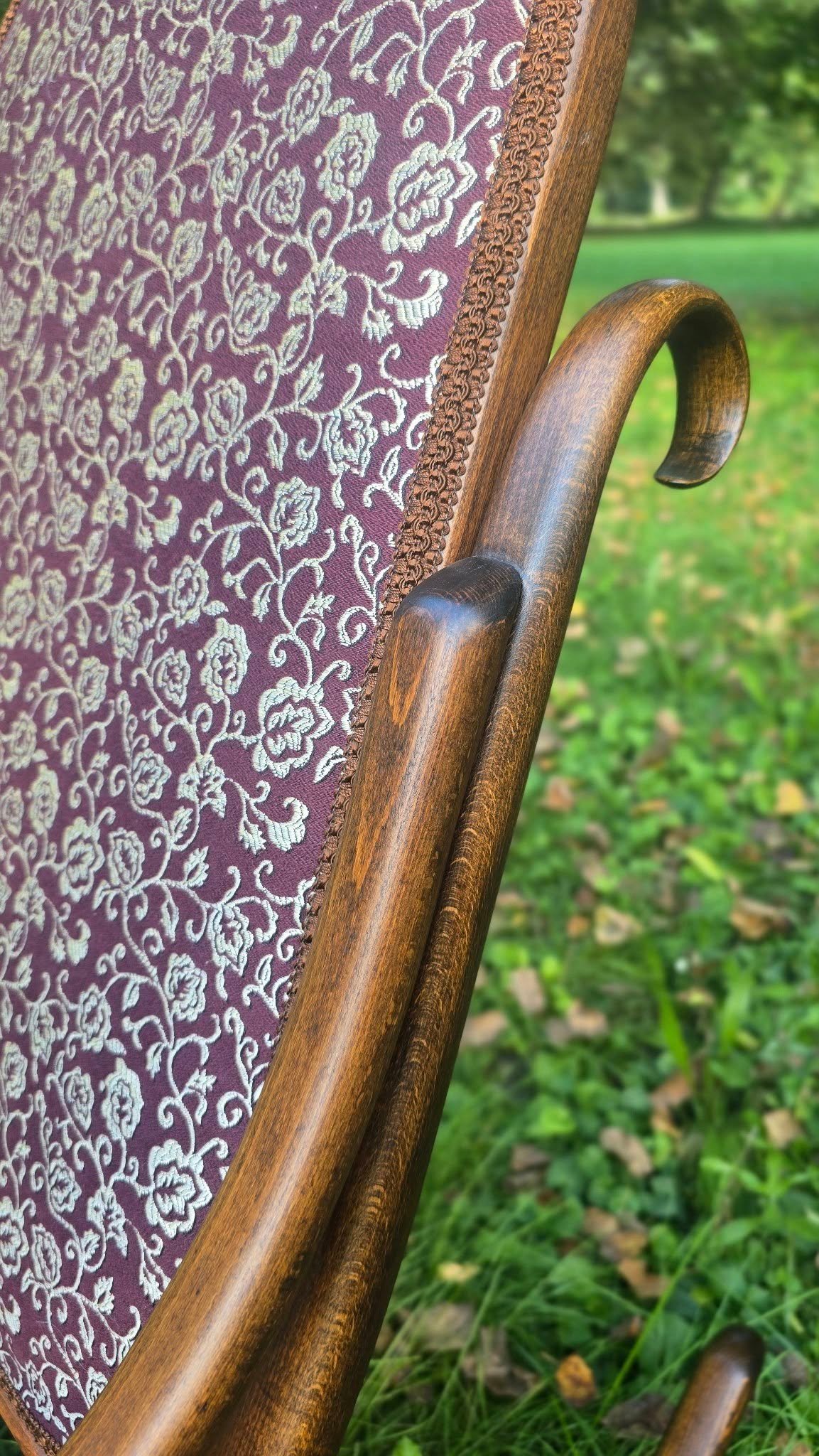 🤗 Pri obnove som venoval pozornosť každému detailu, pretože hojdacie kreslo z ohýbaného dreva si zaslúži len to najlepšie. Pôvodnú konštrukciu som kompletne rozobral, spevnil a opravil. Zbavil som ju vŕzgania a zaistil som jej stabilitu na ďalšie desaťročia. Drevo dostalo nový pigment a ošetrenie. Nová úprava zvýrazňuje bohatú kresbu historického bukového dreva a dodáva mu krásnu hĺbku. Zničený výplet som nahradil čalúnením s exkluzívnou látkou so zaujímavým vzorom, ktorá kreslu dodáva luxusný a útulný rozmer.