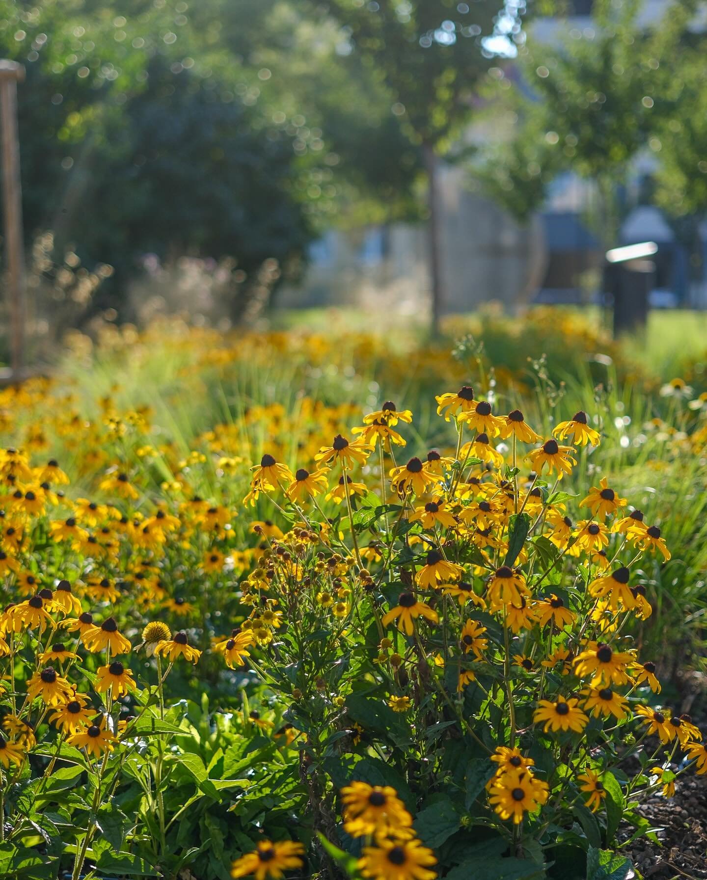 🌿 nová zeleň a vodozádržné opatrenia, vďaka ktorým dažďová voda zo strechy internátu zavlažuje zeleň