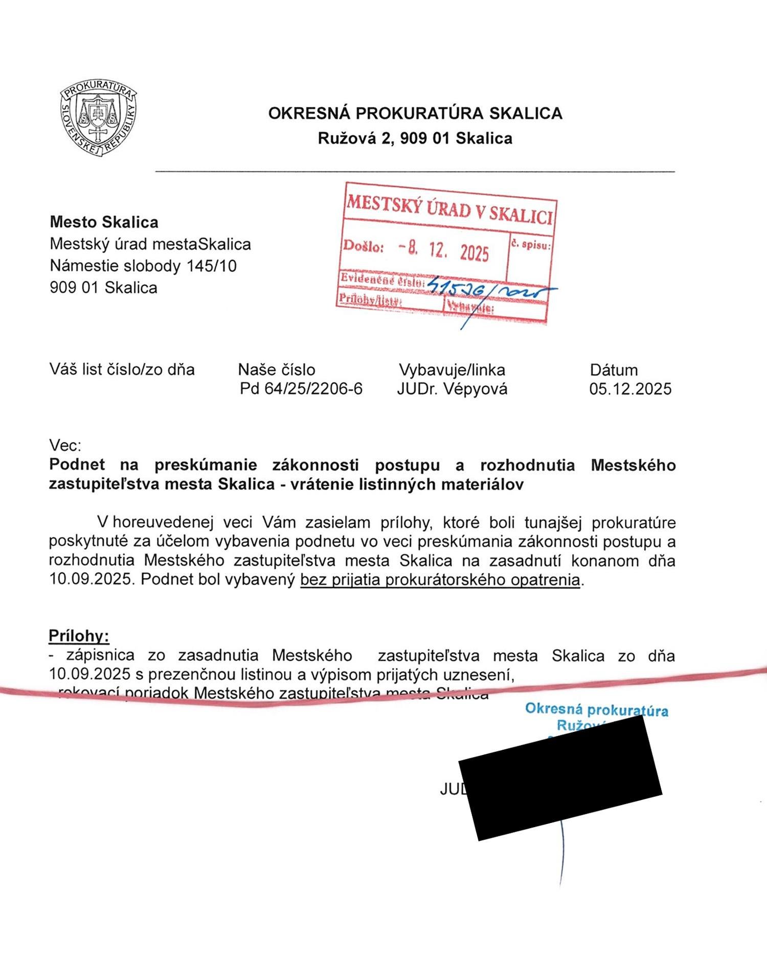 🛡️ Okresná prokuratúra Skalica doručila Mestu Skalica rozhodnutie o dvoch podnetoch. V oboch prípadoch bol podnet vybavený bez prijatia prokurátorského opatrenia s výsledkom ‼️ postup Mesta Skalica BOL ZÁKONNÝ ‼️