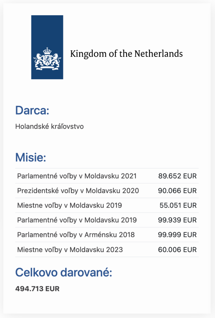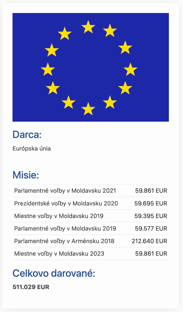 Na zozname darcov sú Európska únia, Holandsko a Švédsko. Tieto krajiny a organizácie už roky financujú voľby v Moldavsku a v niektorých prípadoch aj v Arménsku.