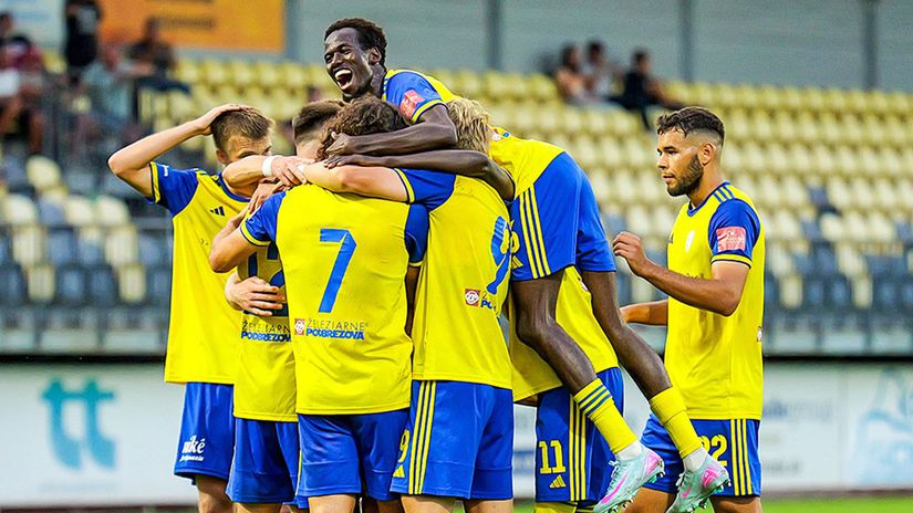 Futbalisti FK Pohronie zvíťazili nad Sláviou TU Košice 4:1 v piatkovom zápase 6. kola MONACObet ligy. Gólová radosť futbalistov FK Pohronie.