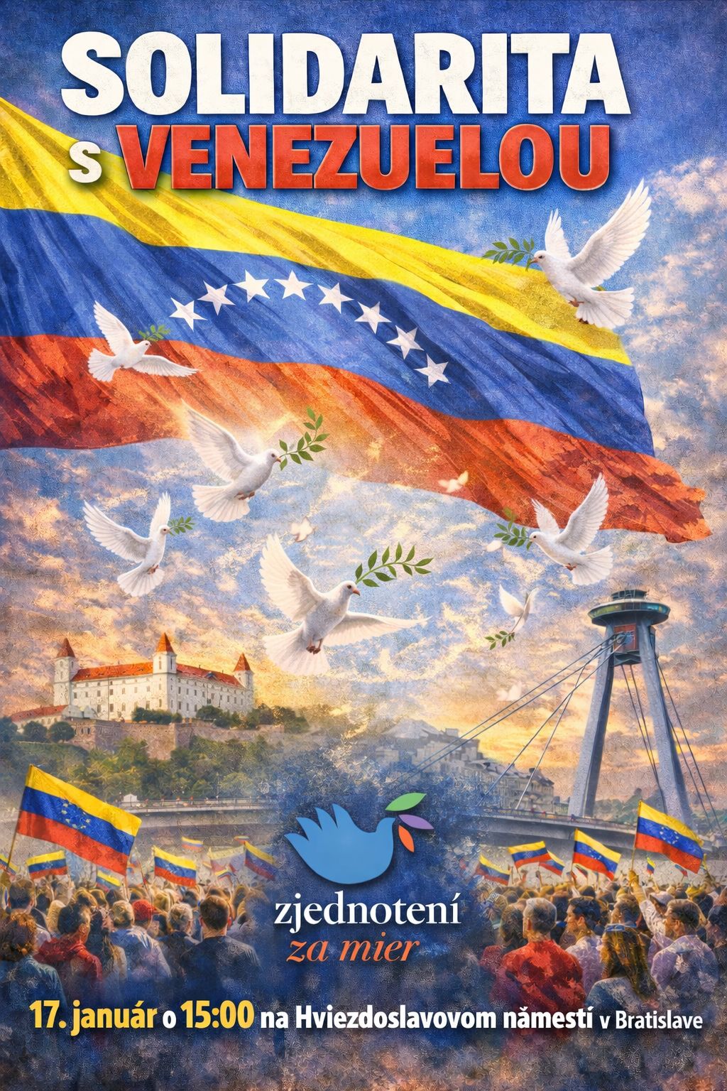 Presne o týždeň (v sobotu, 17. januára 2026) sa na celom svete uskutočnia masové demonštrácie pod hlavičkou GLOBÁLNY AKČNÝ DEŇ SOLIDARITY S VENEZUELOU. V hanbe nechceme zostať ani my na Slovensku, a tak sa všetci mierumilovní ľudia stretneme o 15.00 hod. pod sochou nášho najväčšieho protivojnového básnika Pavla Országha Hviezdoslava, priamo pred Veľvyslanectvom USA na Hviezdoslavovom námestí v Brstislave. Organizátor demonštrácie, občianske združenie ZJEDNOTENÍ ZA MIER, pozýva na toto podujatie aj zástupcov všetkých poslaneckých klubov v NR SR a dáva im tak možnosť, aby vyjadrili svoj vzťah k dodržiavaniu medzinárodného práva a presadzovaniu mieru vo svete.