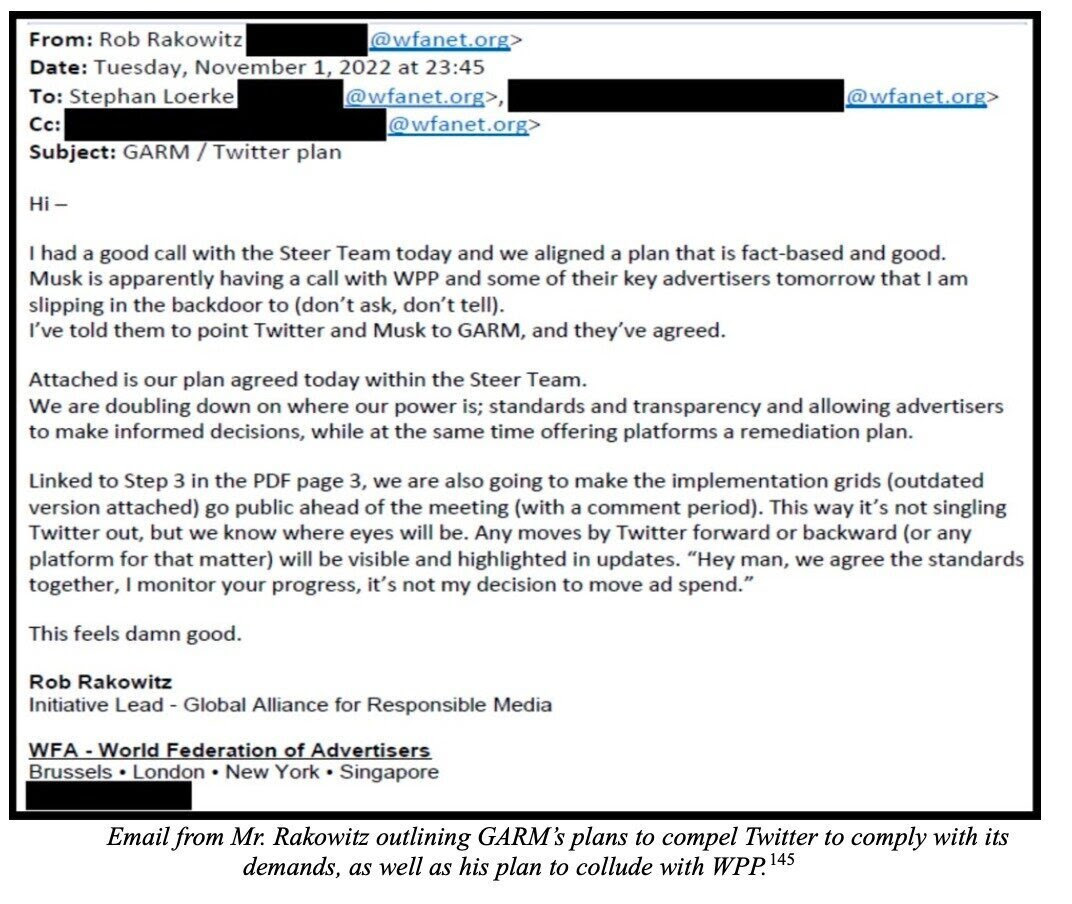 Správa načrtáva, ako GARM šíril predtým nedostupné neverejné informácie o dodržiavaní štandardov Twitterom, pričom si bol plne vedomý toho, že by to viedlo inzerentov k bojkotu platformy, ak by ich nedodržal. Podľa správy Snemovne reprezentantov Rakowitz pripustil, že toto zdieľanie informácií bolo navrhnuté tak, aby povzbudilo členov, aby na Twitteri neinzerovali.