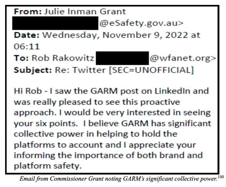 Výbor zdôraznil, ako sa GARM snažil „efektívne znížiť dostupnosť a monetizáciu“ obsahu, ktorý považoval za škodlivý, bez ohľadu na verejný dopyt po slobode prejavu.