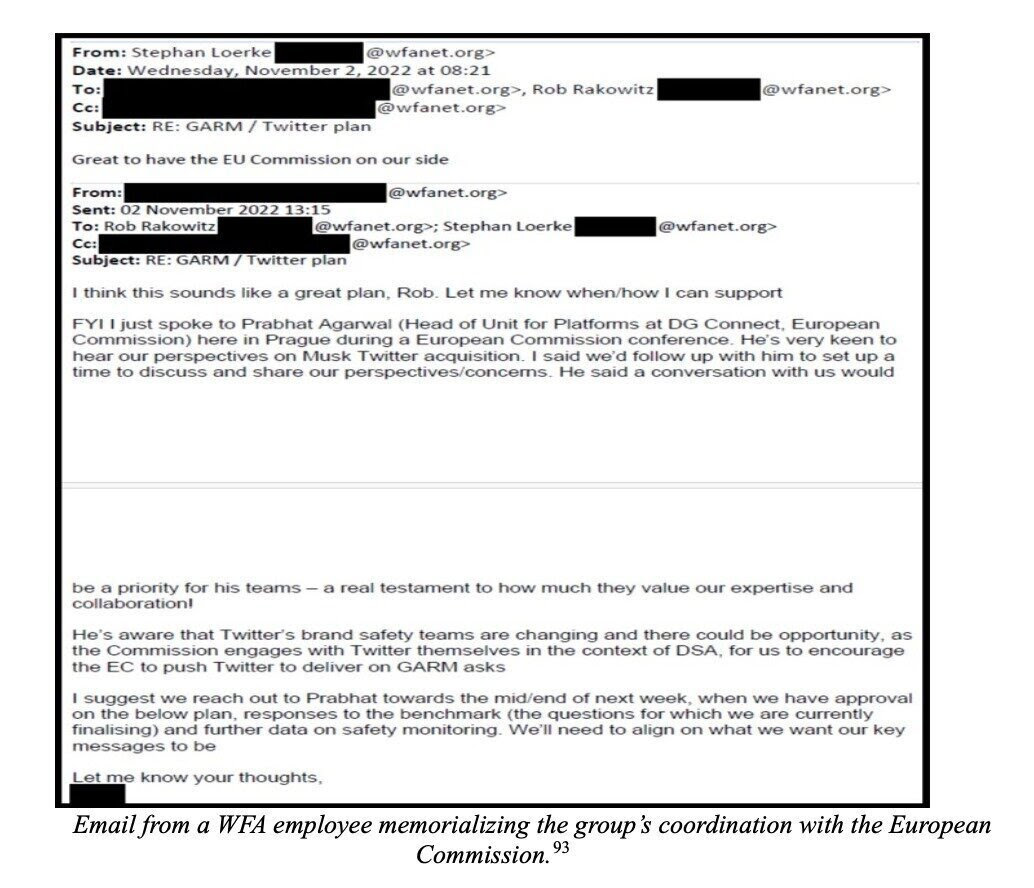 Dokumenty, ktoré výbor získal, odhaľujú priamu koordináciu medzi GARM a zahraničnými regulačnými orgánmi vrátane EURópskej komisie a austrálskeho komisára pre elektronickú bezpečnosť.
