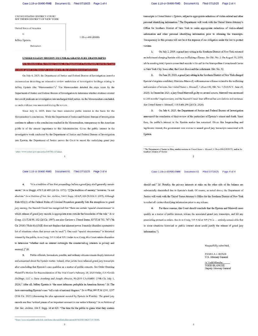 Trumpovo ministerstvo spravodlivosti formálne žiada súd v Manhattane o odtajnenie výpovede veľkej poroty v prípade Epsteina.
