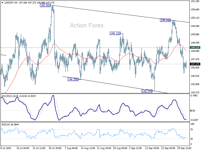 Intradenný bias v USD/JPY zostáva na poklese, keďže pokles z 149.95 pokračuje smerom k 145.47. Silná podpora odtiaľ udrží vzor od 150.90 ako opravný. To znamená, že rast z 139.87 by mal pokračovať neskôr. Avšak, rozhodujúce prelomenie 145.47 naznačí krátkodobý obrat a prinesie hlbší pokles k podpore 142.66.
